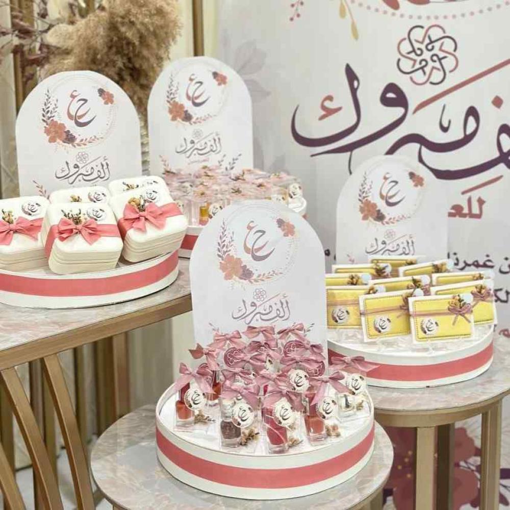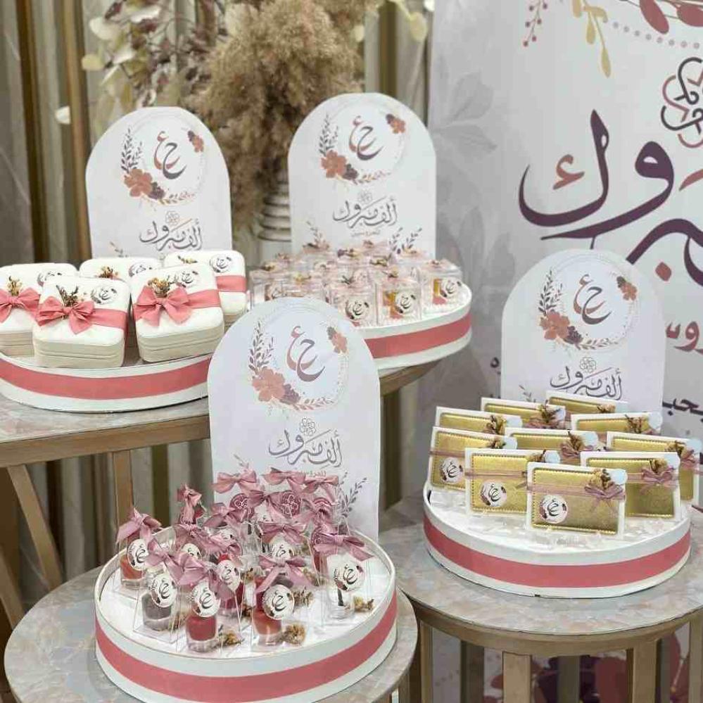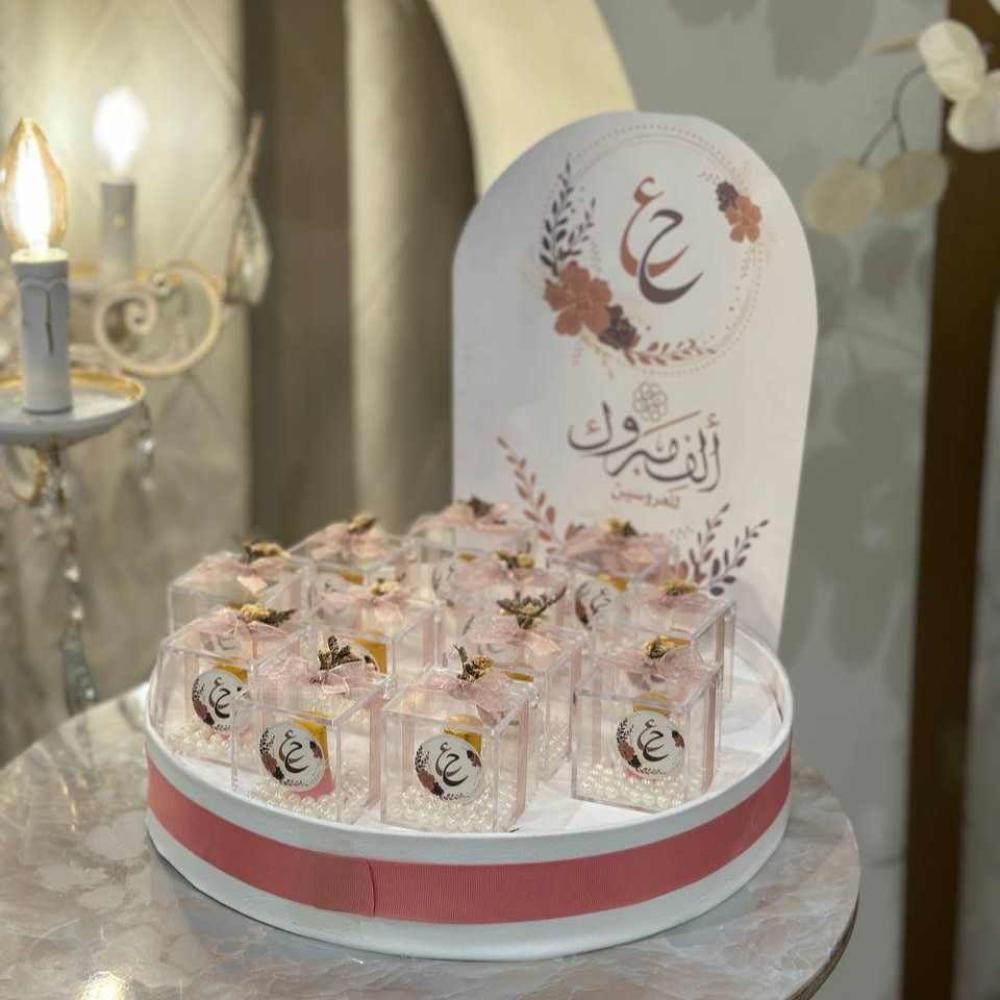 اجعل لحظات حفل زواجك أكثر سحرًا وجمالا مع بكج المسرة من متجر أمسيات يحتوي على 96 توزيعة متنوعة بتنسيق أنيق وبأسماء العرسان أو حروفهم .